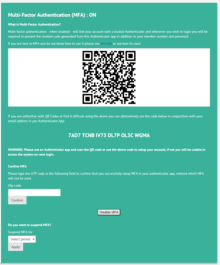 Multi-Factor authentication - when enabled - will link your account with a trusted Authenticator and whenever you wish to login you will be required to present the random code generated from this Authenticator app in addition to your member number and password.